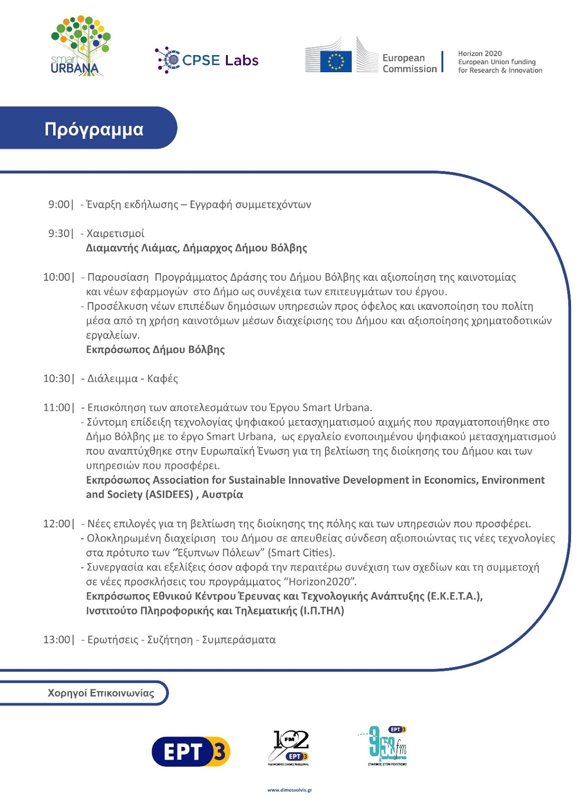 10:00| – Παρουσίαση Προγράμματος Δράσης του Δήμου Βόλβης και αξιοποίηση καινοτομίας, νέων εφαρμογών ως συνέχεια των επιτευγμάτων του έργου. Προσέλκυση νέων επιπέδων δημόσιων υπηρεσιών προς όφελος του πολίτη, μέσα από τη χρήση καινοτόμων μέσων διαχείρισης του Δήμου και αξιοποίησης χρηματοδοτικών εργαλείων. Εκπρόσωπος Δήμου Βόλβης